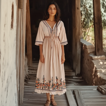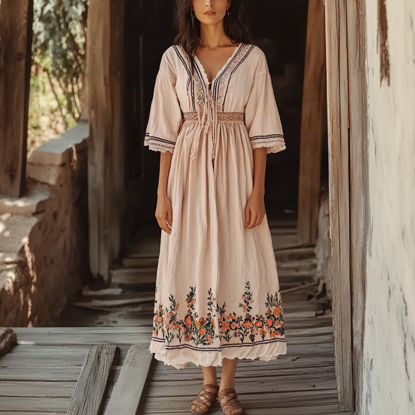 Ladies Vintage Western Cowgirl Chic Ethnic Style Print Cotton Linen Lace Boho Dress